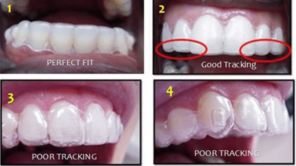 When you are finished wearing your current tray, it should”fit like a glove,” as in #1 above. But if you haven’t been diligent about wearing your aligners EXACTLY as instructed, your treatment will fall behind, as displayed by the tray not fitting, as in #3 and #4 above.